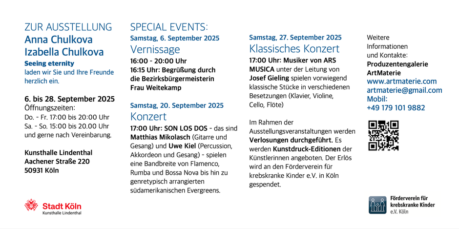 Izabella und Anna Chulkova sind Schwestern und Künstlerinnen aus Köln. Seit vielen Jahren beschäftigen sie sich intensiv mit der Malerei und der Suche nach Ausdrucksformen, die über das Sichtbare hinausgehen. Ihre gemeinsame Ausstellung in Lindenthal widmet sich dem Thema „Ewigkeit“ – einem Begriff, der beide fasziniert und tief berührt.